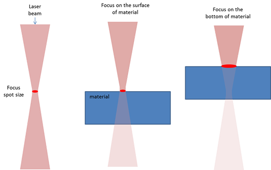 Đặt vị trí lấy nét càng gần bề mặt trên cùng với chất lượng vết cắt cho phép. Điều này giảm thiểu lượng vật liệu bề mặt tương tác với chùm tia khi bắt đầu quá trình, do đó tối đa hóa mật độ công suất của chùm tia, dẫn đến tan chảy nhanh hơn.