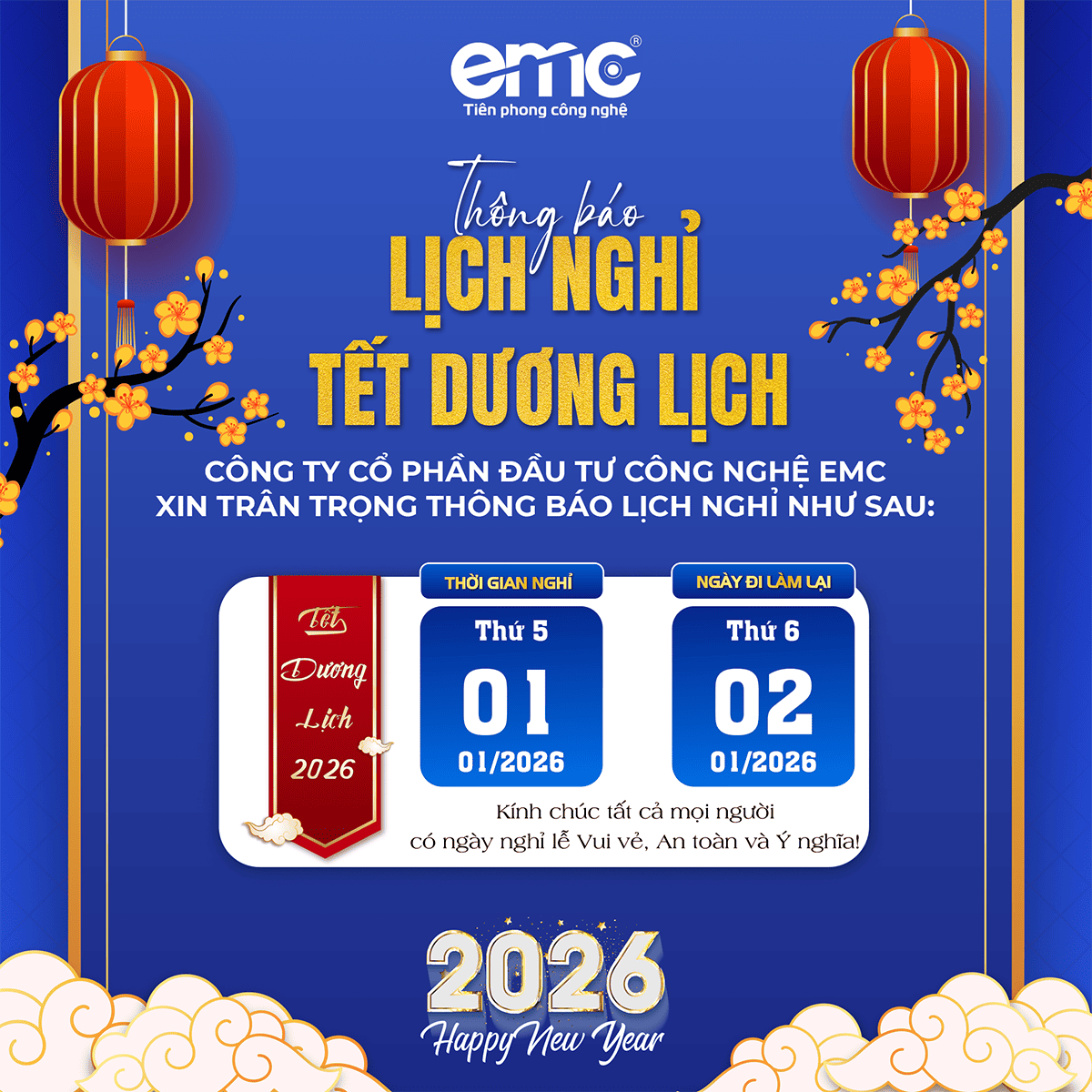 Thời gian nghỉ Tết Dương lịch 2026 của công ty EMC diễn ra vào Thứ 5, ngày 01/01/2026. Đây là thông tin quan trọng để bạn điều chỉnh tiến độ giao nhận linh kiện và thiết bị.